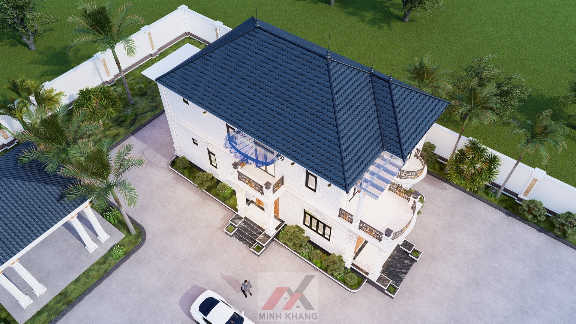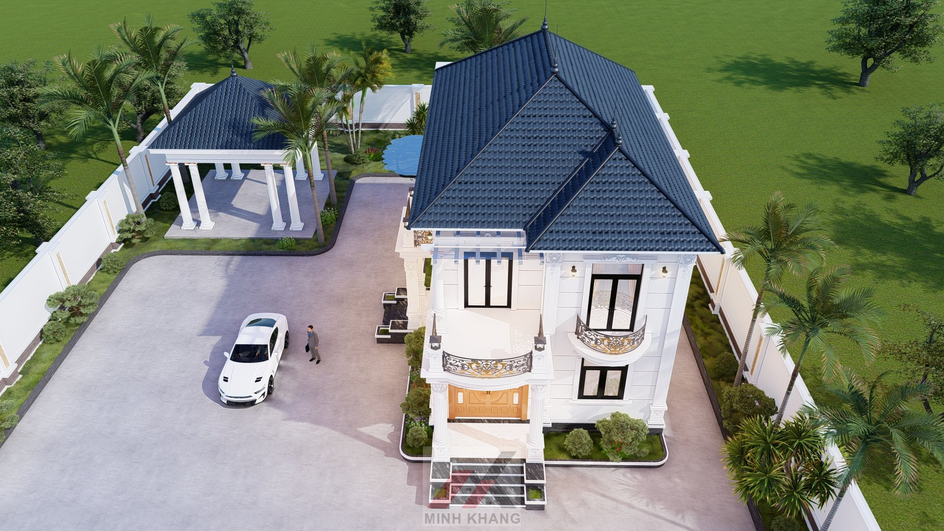 Gam màu trắng thanh lịch kết hợp với mái ngói xanh than, phào chỉ tinh xảo và hệ cột trụ vững chãi tạo nên tổng thể vừa bề thế, vừa đẳng cấp.