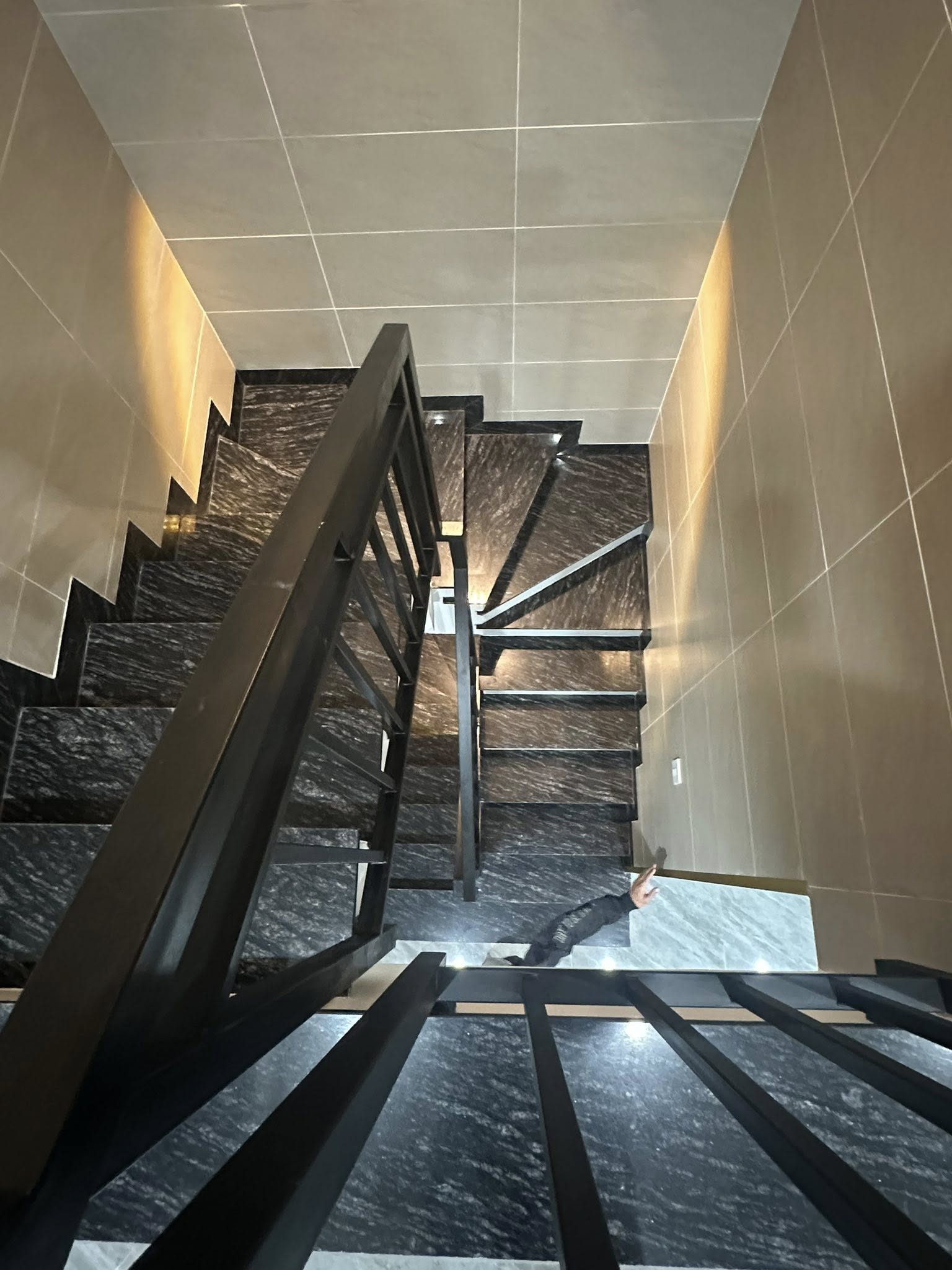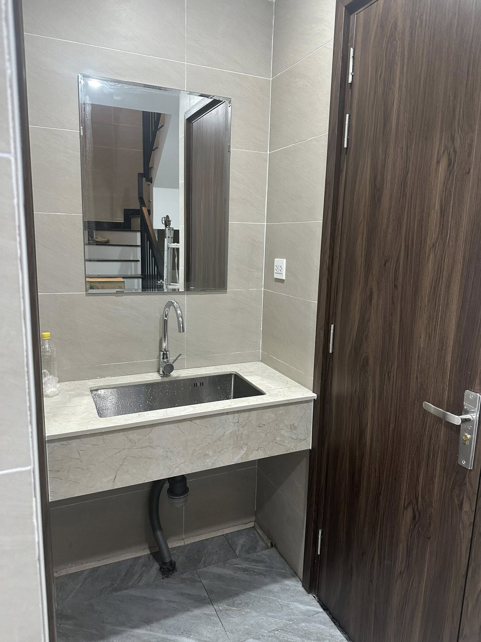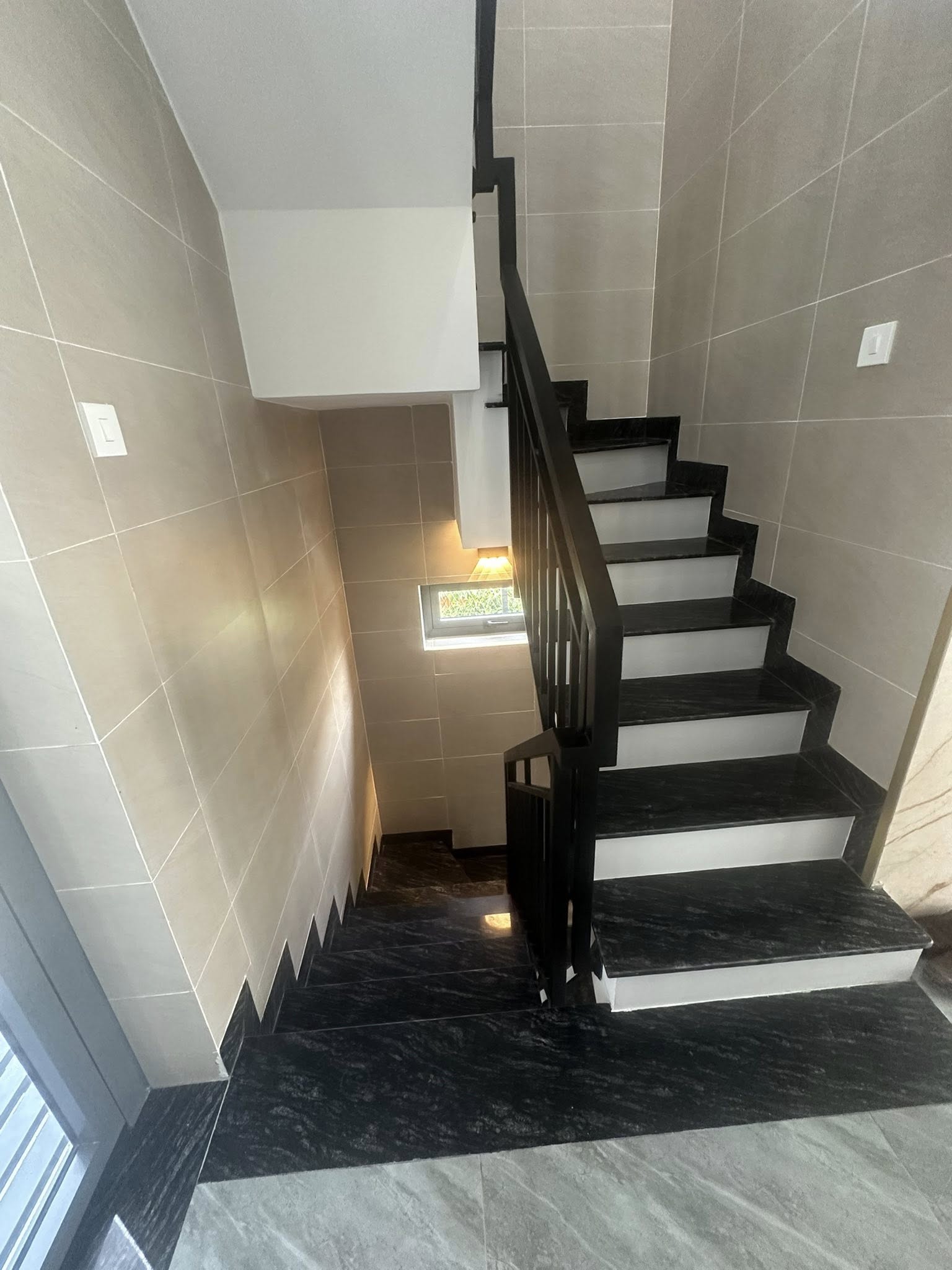 Không gian bên trong sử dụng gạch ốp tường màu trung tính, cầu thang đá tự nhiên, cửa kính khung nhôm cao cấp – vừa tăng độ bền, vừa giúp ánh sáng lưu thông tốt.